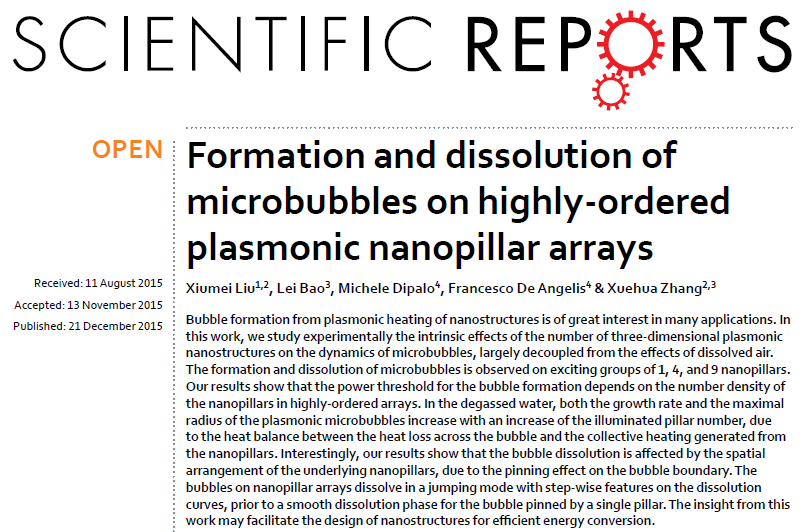 近日,黑料网 副教授刘秀梅老师在Nature旗下综合期刊《Scientific Reports》发表了题为“Formation and dissolution of microbubbles on highly-ordered plasmonic nanopillar arrays”的学术论文。该系列工作是刘秀梅副教授在荷兰屯特大学博士后期间与澳大利亚皇家墨尔本理工大学和意大利理工学院研究者合作的重要研究成果。该杂志隶属于Nature出版集团,是学术领域顶级的杂志之一,具有广泛的学术影响,目前影响因子为5.578。