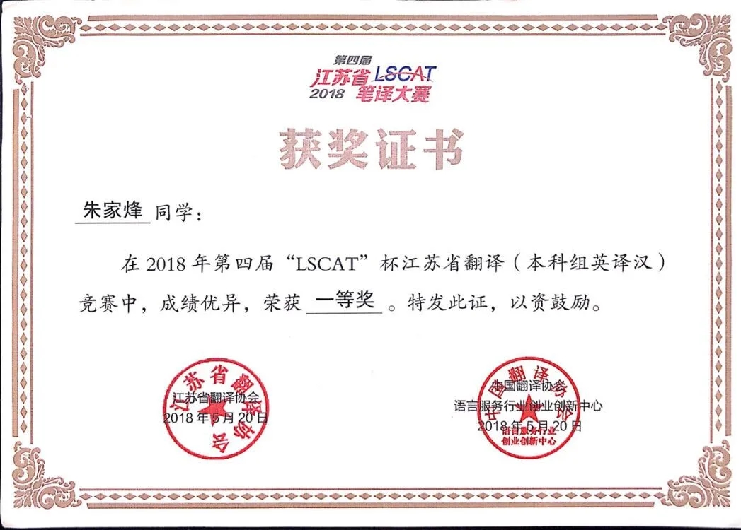 第四届“LSCAT"杯江苏省翻译竞赛一等奖