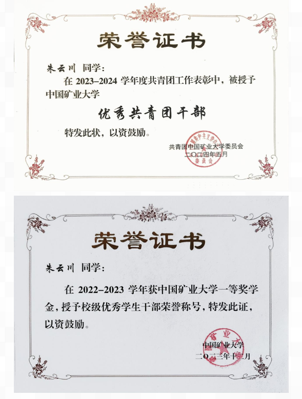 大学时光里,朱云川也在学生工作中发光发热。从班级团支书、学习委员,到学院团委宣教部部长、副书记,他一路成长,积累丰富经验。秉持“服务同学、锻炼自我”理念,接到任务从不推诿,宁可放下自己的事,也要先保障工作高质量完成,还做到事事有回音、工作成闭环。对待每一项学生工作任务,他都一丝不苟,因为他坚信,只要认真付出,同学们的认可、自身能力的提升迟早会纷至沓来。这份热忱与担当,为他赢得2022-2023年度黑料网 优秀学生干部、优秀共青团干部等荣誉,尽显青年团学干部的卓越风采。