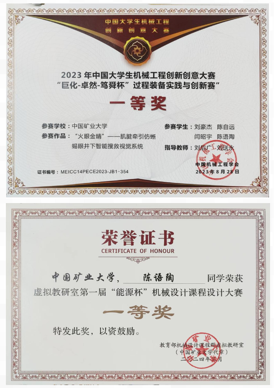 除了学习上的收获,陈语陶还踊跃参与各类实践活动,努力将理论知识应用于实际。她参与了国家大学生创新创业项目,通过实践进一步巩固了所学知识。在竞赛方面,她表现出色,先后获得了全国三维数字化创新设计大赛国家一等奖、中国大学生机械工程创新创意大赛国家一等奖、“能源杯”机械设计课程设计大赛一等奖等多项荣誉。这些成绩的背后,是她无数次的辛勤付出和不懈努力。