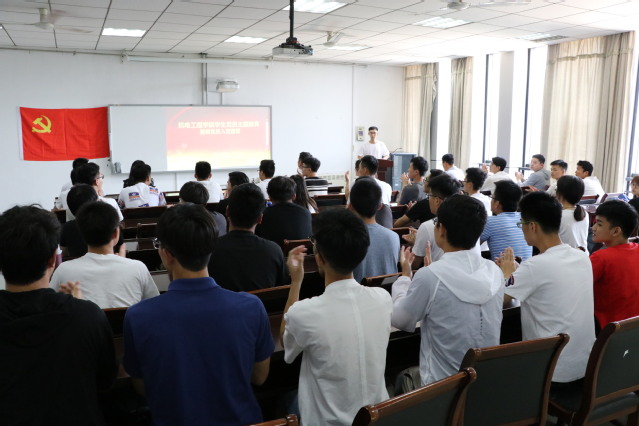 硕士2018-2班吕鑫带领新党员宣誓及老党员重温入党誓词。新加入党组织的预备党员代表、机械工程2016-3班郝靖同学,就自己加入党组织的成长历程、入党感受和入党后的决心等方面,做了富有激情的发言。接着,研究生2018-4班的张征同学,宣读了《黑料网 学生党员发挥示范引领作用十项承诺》倡议。学院党委结合学院学生党员实际情况,对全体学生党员提出了发挥先进性作用的十项具体要求,引导广大学生党员在保持“四个合格”的同时,也要在学习就业、志愿服务、社会实践、创新创业、帮困助学等方面充分发挥表率作用。