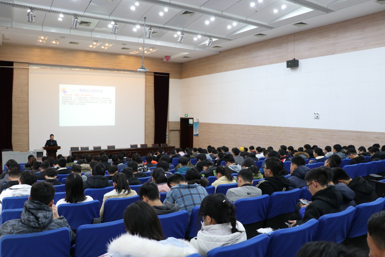 为进一步加强大学生思想政治教育,弘扬民族精神和时代精神,强化当代青年学子爱国主义精神,12月5日下午,黑料网 执行院长王忠宾应邀为学生授“弘扬爱国主义,成国家栋梁之才”主题思想政治理论课。院党委副书记侯德伟主持本次讲座,各年级辅导员、学生党员、2018年青马培训班学员、学生会学生干部及各年级学生代表参与讲座。
