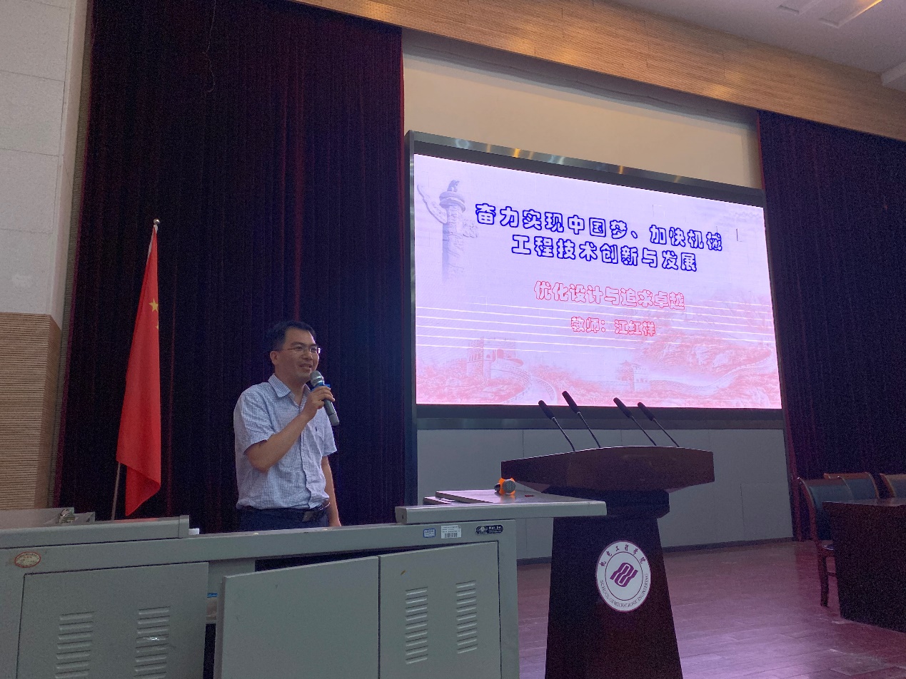 江红祥老师的报告主题为:优化设计与追求卓越。他表示,优化设计离不开创新,追求卓越是发展的动力,当前我国仍有大量卡脖子问题亟待解决,创新是打破国外技术封锁的前提,唯创新者进、唯创新者强、唯创新者胜。最后,江老师结合时代特征,总结了成为时代创新人才应具有的能力,为同学们指引了奋斗方向。