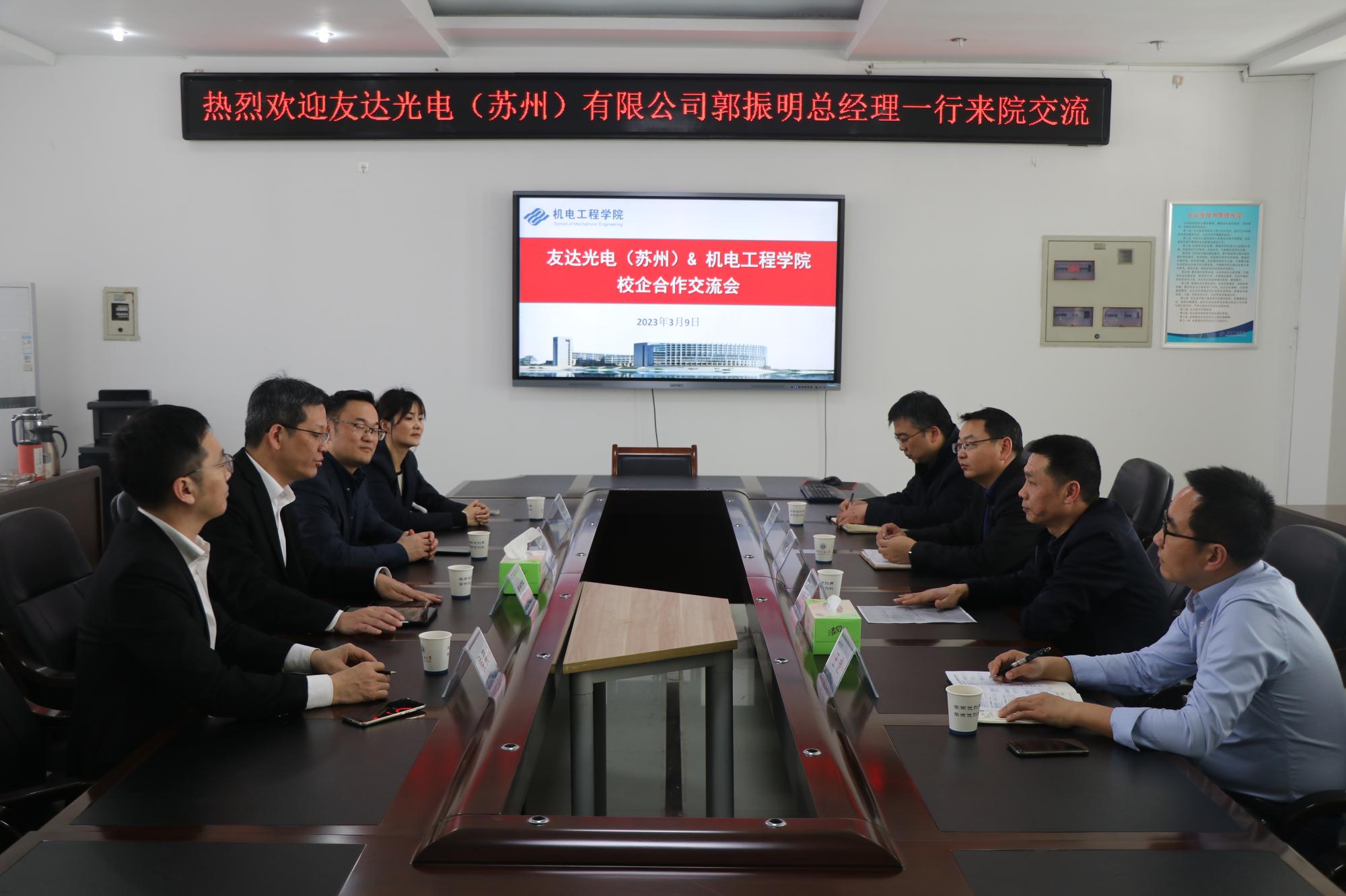 3月9日下午,友达光电(苏州)有限公司总经理郭振明一行来学院开展校企合作交流。院党委书记吴松、党委副书记王虎、教学副院长刘送永、机械制造系主任程延海参加洽谈交流。交流会在机电楼A501举行。