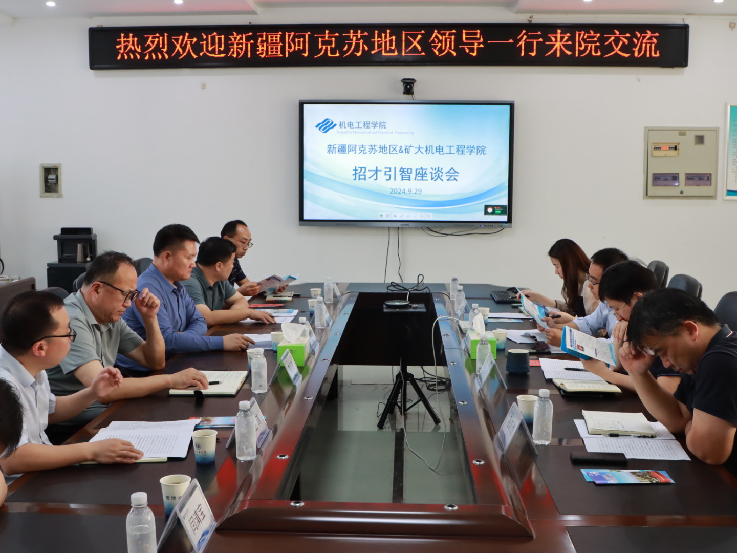 王虎副书记对黄顺春、马继勇一行的到来表示热烈欢迎,他简要介绍了学院毕业生就业工作状况。他表示,学院将找准合作的切入点和突破口,做好人才培养工作,助推阿克苏地区招才引智工作取得新发展。周公博副院长对阿克苏地区在吸引人才和科研团队方面所展现出的诚意和魄力表示高度赞赏,并向与会人员简要地介绍了学院的学科和科研发展情况,他分享了矿大学子在新疆工作生活的故事,希望双方能够进一步加强沟通交流,不断优化完善合作机制,共同推动阿克苏地区经济社会实现高质量发展。