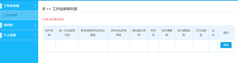四、2019年9月18日至9月27日,申请设站单位凭高校提供的账号、密码登陆系统(可更改密码)。登陆后打开“工作站申报”(如下图),在列表中点“添加”按钮,填写相关信息,并上传申请书(盖章后的PDF格式扫描件)和相关证明材料,确认无误后,提交高校审核。平台开放具体时间为每天8:30-18:00,周末节及法定节假日不开放。