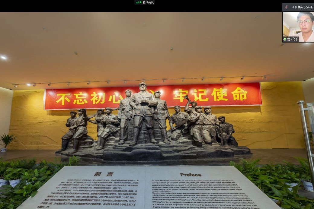 在线上会议上,队员们依次参观了平江起义纪念馆、韶山毛泽东纪念馆等景点。在平江起义纪念馆中,队员们一起回顾了先辈们的不朽事迹。在馆中伟人的雕塑前聆听誓言,在红旗旁重温辉煌的历史,团队成员感到非常骄傲和自豪。纪念馆陈列了许多当年革命先辈使用的武器和生活用品,从中队员们感受到了当年革命先辈们为了民族的解放,不惜抛头颅洒热血,把满腔的热情献给伟大的革命事业的豪情壮志。