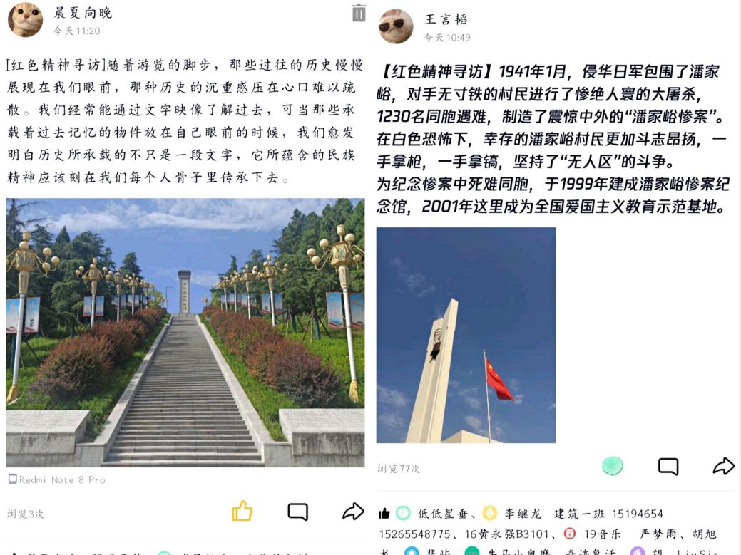 8月27日,小组成员各自前往家乡当地红色景点,在实践过程中,团队成员分别参观各地家乡的爱国主义教育基地。实践团成员在参观红色景点的过程中,认真学习了解所在地的红色革命历史和英雄先烈的战斗事迹,感悟到英雄先辈们不怕牺牲、英勇顽强的革命乐观精神。在完成爱国主义教育基地参观后,实践团队再次组织线上会议。大家相互分享自己参观后的感受、体会。实践团成员朱城立在参观完郧阳革命烈士陵园表示:郧阳革命烈士纪念馆知晓的人并不多。事实上,无论红色景点规模是大是小,都值得铭记。中国革命离不开千千万万的人民,离不开中华民族上下团结一致,只有守护好当地的红色文化和红色历史,这样才能传承给后辈,切勿让历史逐渐被遗忘。会议最后,负责人王言韬组织团队成员进行线上宣传工作,旨在让更多人了解当地红色景点。