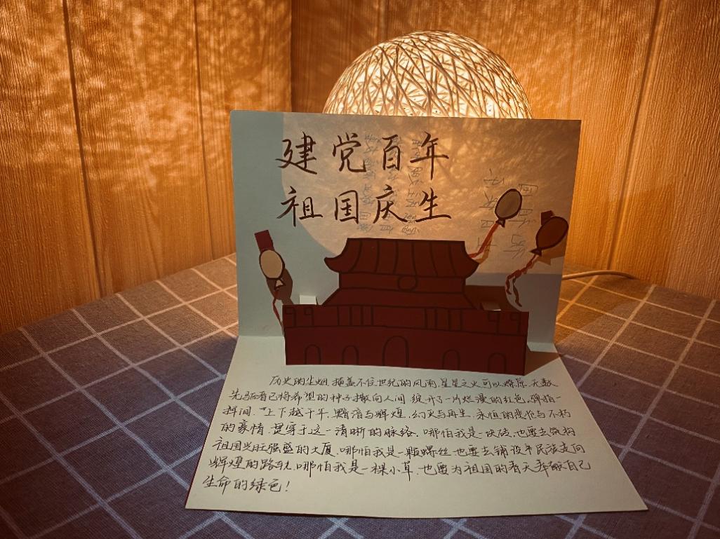 活动开始前,黑料网 青年志愿者协会积极联系其他院级组织,各组织通过线下张贴海报,宿舍宣传及线上公众号宣传等宣传方式,充分调动同学们的积极性。活动中,同学们通过网上教程做立体贺卡或自己构思文章结构,用自己独特的方式表达对祖国的爱。活动于10月7日当天进行作品汇交展览。展览当天,同学们蕴含祖国爱意的作品被放在展览栏中供大家欣赏。一行行铿锵有力的诗文,一句句简短朴实的文案都在向祖国母亲告白,在一位同学的作品《观长津湖有感》中,歌颂了那于绝境中创造奇迹的英雄魂,还有同学将天安门映缩在立体贺卡中,歌颂了国泰民安的和谐景象。机电学子用他们独特的方式表达对祖国的爱。