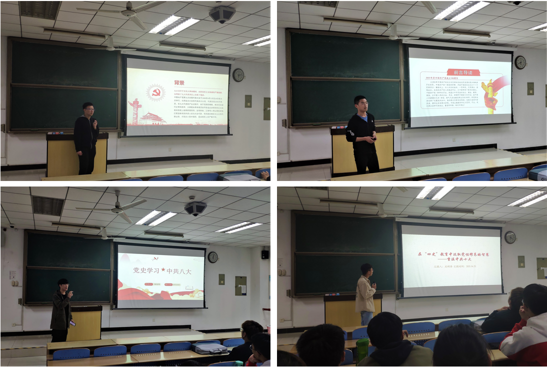 会议开始,孟凡成老师介绍了本次党史学习教育的内容和意义。随后,在陈文强、张琨泽、杨俊辉、王嘉伟和晁明浩五位学生党员同志的带领下,支部全体学生党员和发展对象认真学习了中共六大到中共十大的历史。五位学生党员同志通过满怀深情的讲解和精美的图文资料,带领大家深入学习了不同历史时期和历史背景下中国共产党艰难曲折的发展历程。最后,孟凡成老师勉励支部全体学生党员和发展对象要认真学习党史,增强服务意识,提高党性觉悟。