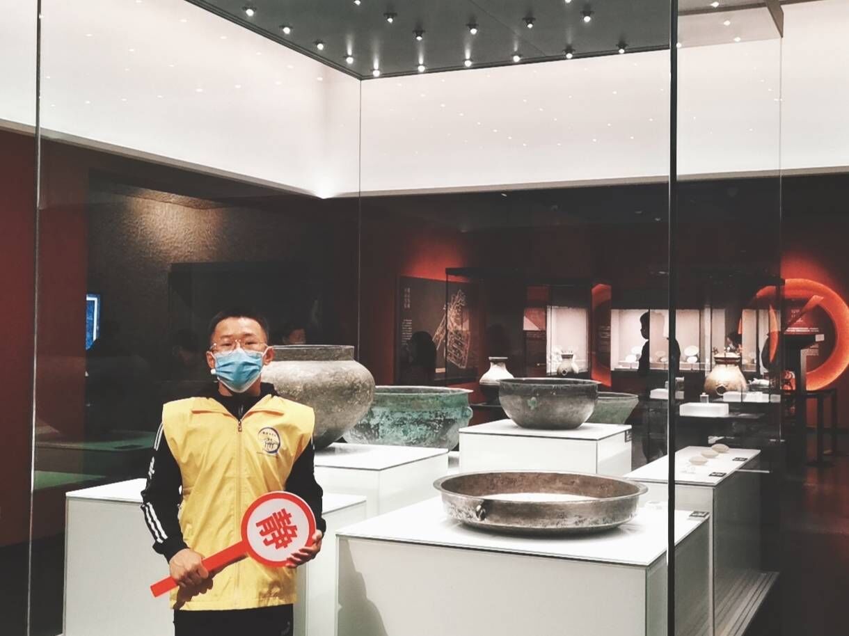 活动开始前,博物馆工作人员为参加活动人员分配好岗位,同时也为同学们讲解了馆内部分藏品背后的故事。在这里,志愿者不仅目睹到了样式繁多的展品,还感受到了历史的厚重。一方土地孕育出一方文化,徐州博物馆触摸着岁月的流淌,也正记录着中国社会的变迁。随后,同学们在不同的岗位纷纷贡献出自己的一份力量,正确引导游客入馆参观、对展厅展品进行介绍、对不当行为进行文明规劝等。最后,同学们对活动场地进行打扫,给文物留下了属于它们的静谧的环境。
