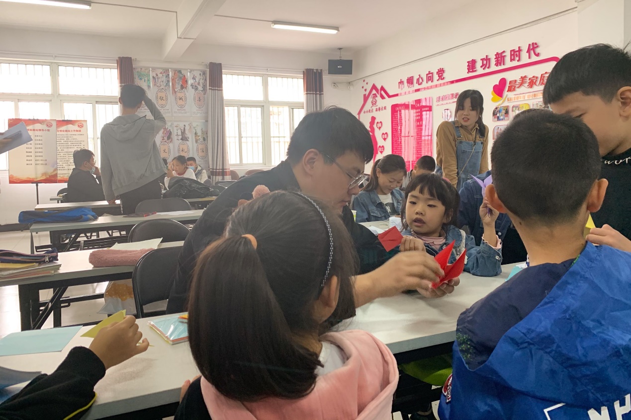 志愿者教小朋友做简单的折纸手工