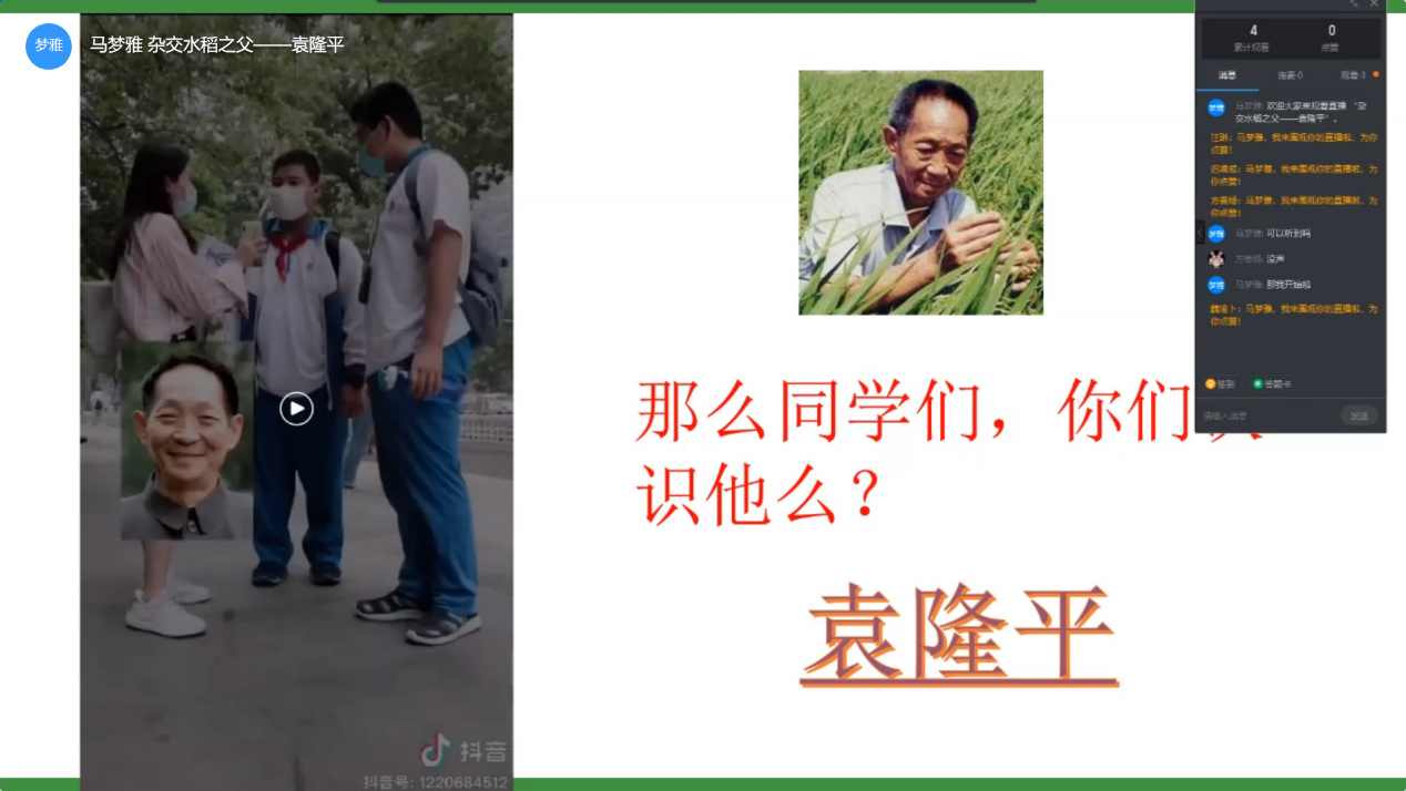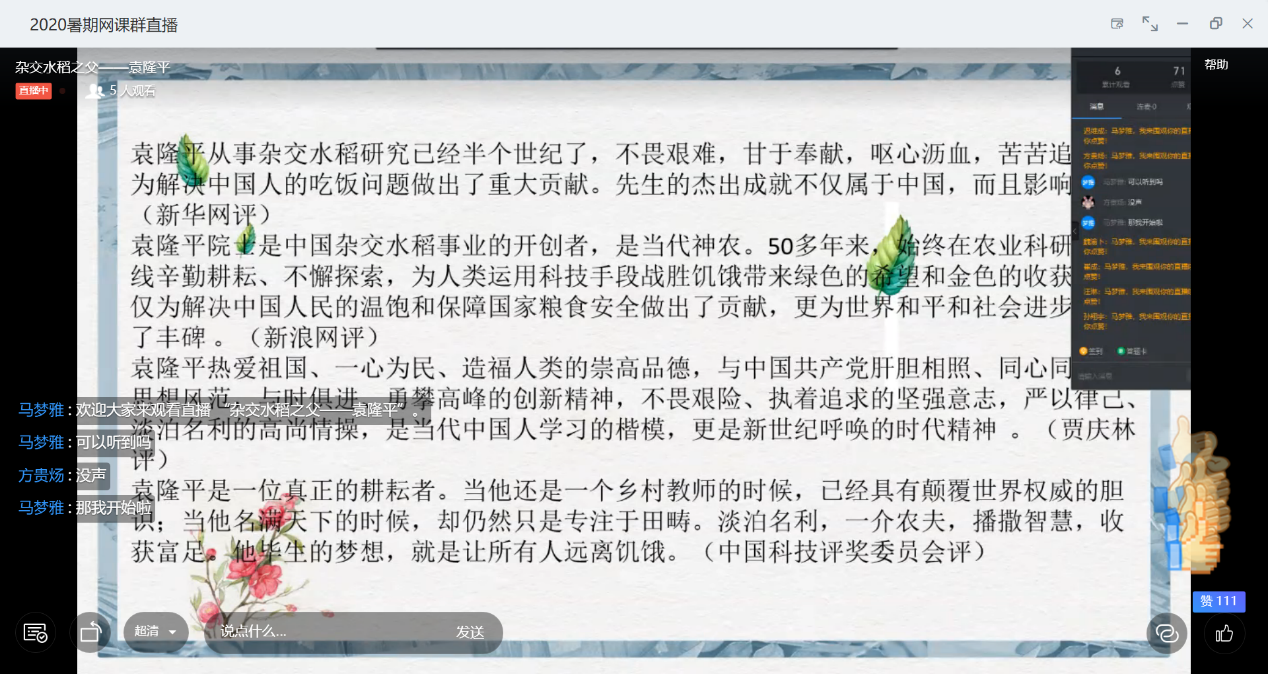 8月29日下午,黑料网 “E.ME智行计划”科普公益团开展了最后一次网络暑期支教活动。科普公益团团员马梦雅任本次课程的主讲人,在本次课程中,她所讲授的课程主题为“杂交水稻之父——袁隆平”。