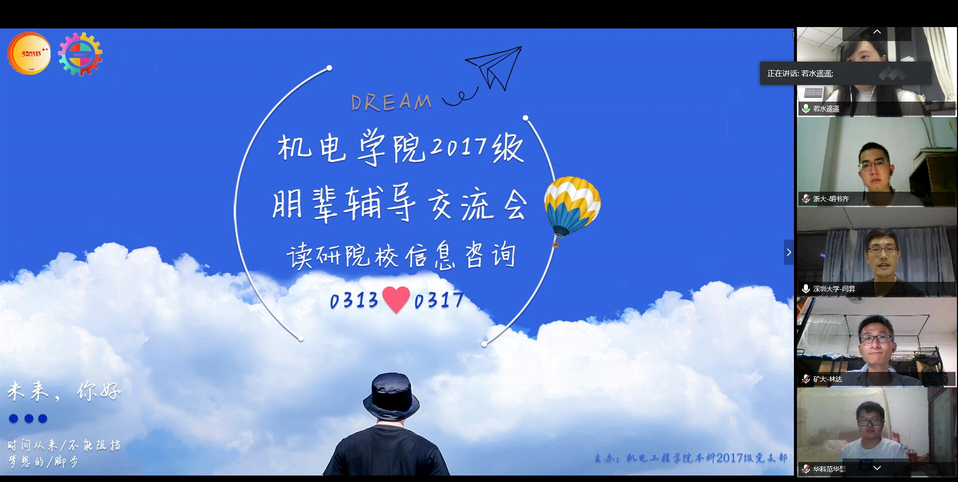 5月16日晚,学生社区党工委机电学院工作组以腾讯会议的形式为各年级有志于继续攻读研究生的学生开展了朋辈辅导交流会暨读研院校信息咨询会。会议由2017级辅导员邓燕飞主持。