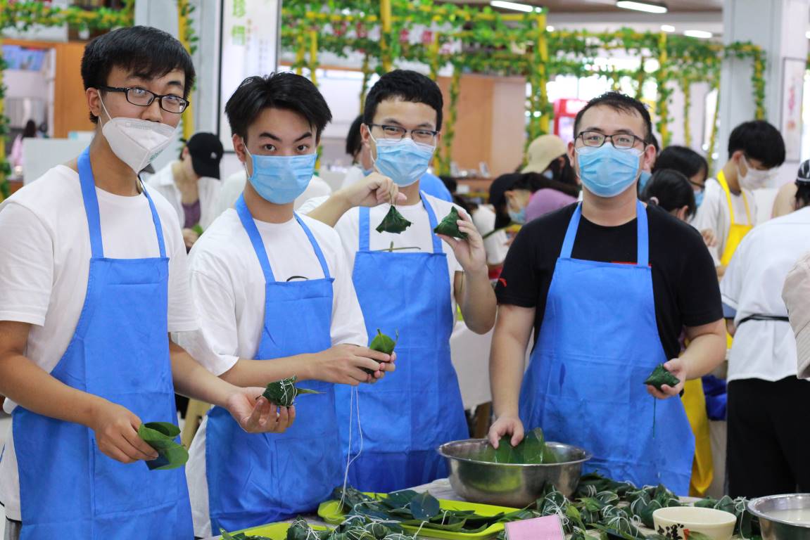 活动开始前,同学们在团支书带领下依次在门口洗手消毒,测量体温,进入活动现场。活动伊始,总务部第二党支部书记表示,这个活动旨在通过学习包粽子技巧、体会包粽子过程来加深同学们对端午节的认识和加强同学们自身的民族文化自信,并宣布活动正式开始。随后,五组成员进行了共计一小时的包粽子竞赛。在包粽子的过程中,团员和党支部成员们欢声笑语,互相帮助,伴着背景音乐《我和我的祖国》,认真学习摸索着食堂阿姨的手法技巧,最后呈现出一个个形状各异的甜口和咸口的粽子。粽子包完以后,评委对各组的成品进行点评并发放奖品以示鼓励。活动最后,参与活动的成员们一起合唱了《我和我的祖国》,并拍照留做纪念。