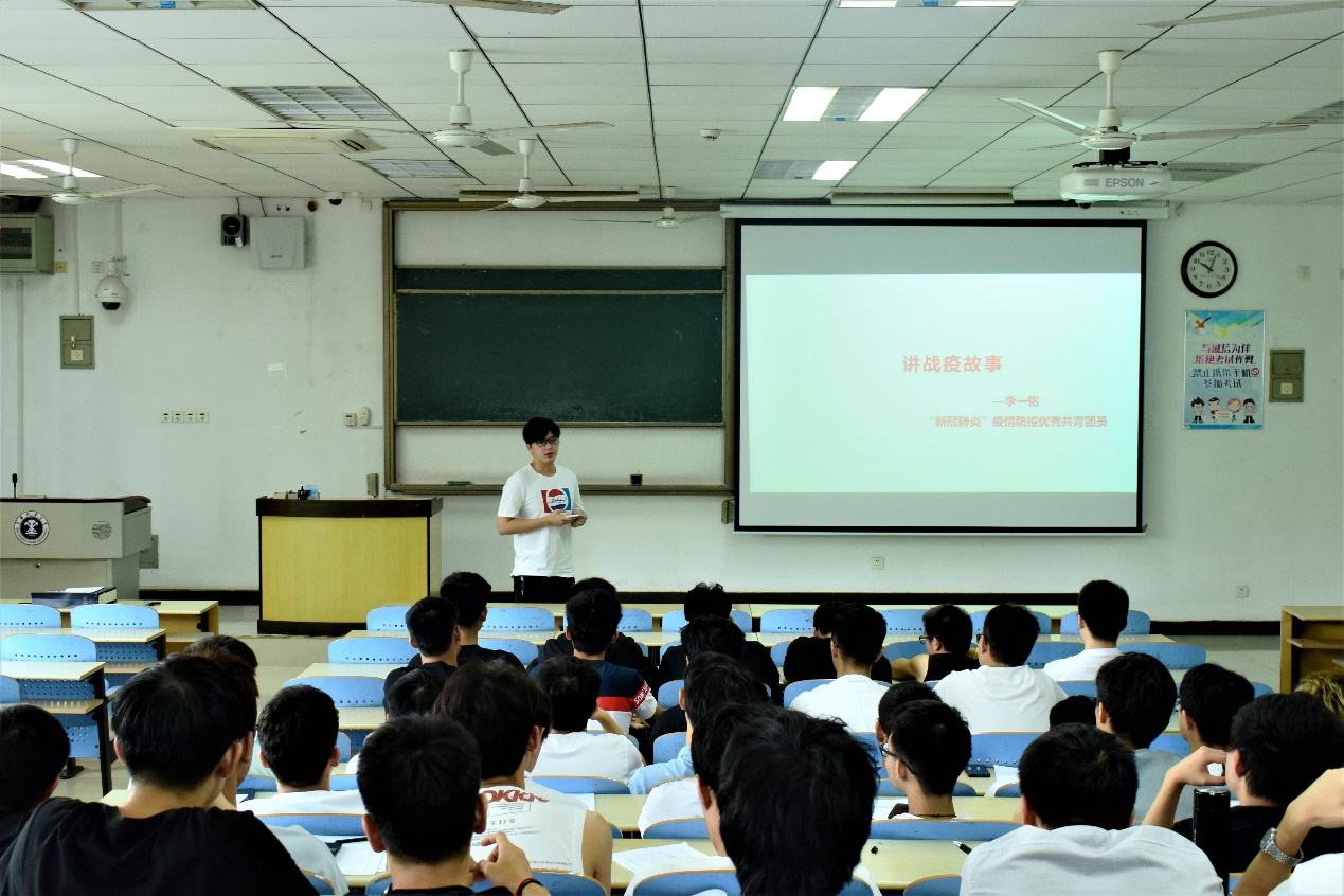 活动中,孟凡成老师从坚定学生思想教育、摸排学生健康信息、做好学生生涯指导等方面讲述了他作为年级辅导员在疫情防控期间的抗疫故事,并向同学们介绍了为做好开学返校工作学校全体老师和志愿者同学所做的辛勤努力;校“新冠肺炎”疫情防控优秀共青团员李一铭同学向大家讲述了他在家乡做防疫志愿者的故事,从遇到发热病人时的惴惴不安,到感动于来自四面八方对志愿者的关怀,李一铭同学在做志愿者期间,体会了奉献精神,树立了合作意识,实现了自身从少不更事到勇于承担的转变;机械类2019-6班网格负责人晁明浩同学讲述了他提前返校做志愿者以及在正式开学后负责班级同学防疫管理中的故事,在接到学校号召后毅然提前返校,协助做好开学前准备工作,开学后提醒班级同学做好健康情况监测,并及时将每日健康情况向学院反馈。在这场疫情防控攻坚战中,每一个小我都在默默耕耘,共同助力最终的胜利。