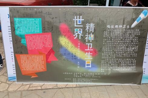 活动开始,心自助团辅部的工作人员热情地向过往的同学发放活动传单并认真地讲解了有关世界精神卫生日的知识以及标牌板上的内容。工作人员待人亲切,态度认真。因此同学们也都表现了极大的兴趣,驻足停留并仔细的吸收有关知识。在了解大致的内容后,同学们受邀在标牌板上签下了姓名,代表自己会采取行动来保持和维护心理的健康。