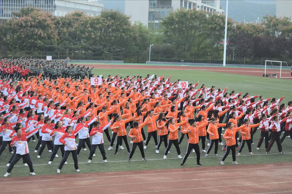 由七十多名2019级新生组成的体操表演方阵,在田径场上,他们动作舒展大方、整齐划一,人人凝神静气,精神抖擞。在橙色的队服下,机电学院体操方阵将整套动作完美演绎出来,让他们似朝阳冉冉展现风采。