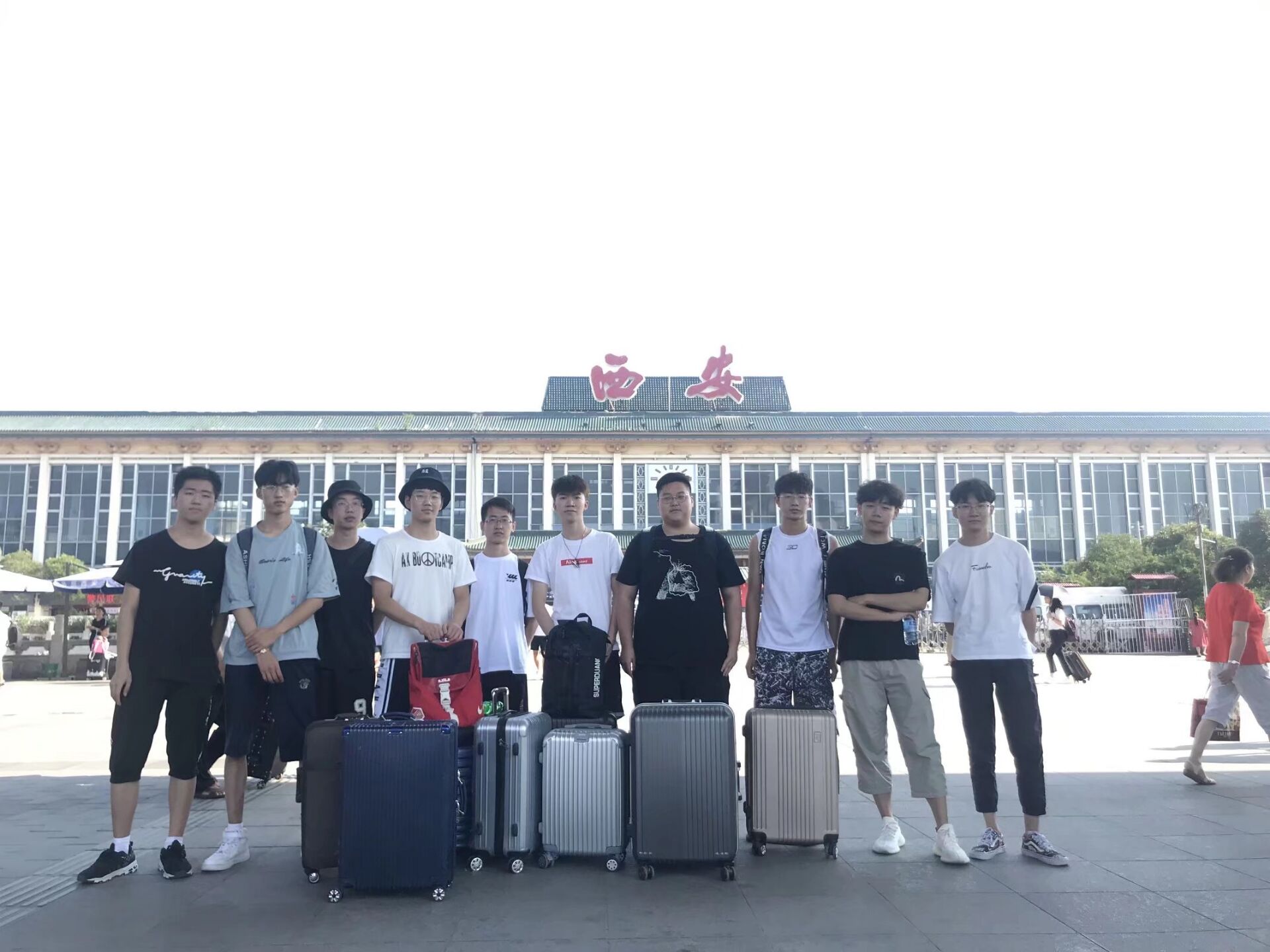 西安暑期实践团一行人到达西安火车站合影留念