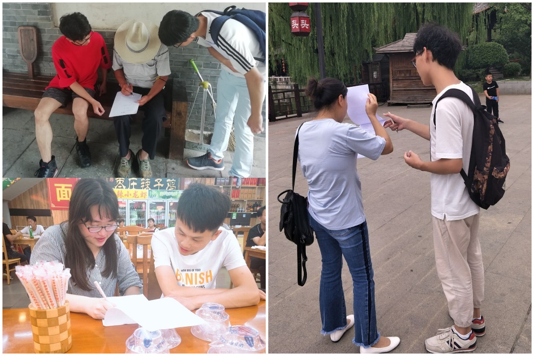 当天下午,台儿庄历史文化社会实践团成员们就台儿庄古城文化等各类文化与当前人们对文化的了解现状进行了调研,调研采用街头采访并记录对话的形式,两名队员一组,在台儿庄古城景区中随机选取游客进行采访。采访有意识地向各个年龄段全面开放,老年中年少年皆有涉及,所有受采访者都非常配合并积极地回答问题,加深了实践团成员们对台儿庄文化古城的认识。