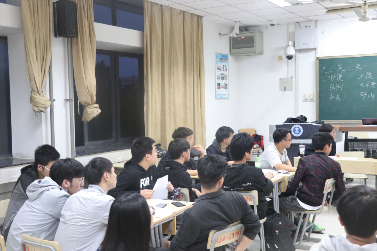该活动以探险掘金为故事背景,通过模拟团队成员在沙漠中探险掘金的过程,对团队的计划和资源配置能力、人员间沟通合作能力、面对竞争压力和环境突变的能力进行综合考察。这场掘金大战中,“存活”到最后并且将最多的“金子”带回基地的队伍获得胜利。主持人首先为参赛同学详细介绍游戏规则,各团队根据比赛设定开始紧张的内部协商策划。参赛院队认真讨论队伍需要携带的物品、可能遇到的天气,并合理运用数理分析对比赛的走向概率进行了计算,安排相应记录和应急方案。决策时间结束后,各队伍依次将书面决策交给现场监督员。比赛现场气氛活跃,各参赛成员不间断进行讨论交流、制定更改计划。有的队伍决策合理,一路畅通;有的队伍则因判断失误,遭遇了太多恶劣天气,最终因为物品消耗殆尽而不得不退出比赛。