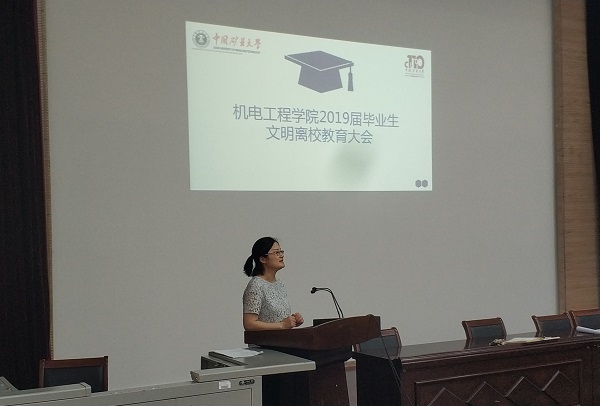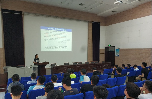 大会开始,辅导员李梅子就给学生说明了毕业设计的时间安排以及申优答辩的相关事宜,安抚学生的焦虑情绪,鼓励15级学生把握最后的时间,提高画图的工作效率,希望所有人都顺利的通过毕设答辩。接着李梅子又告知学生毕业照和毕业晚会的安排工作和具体时间,提出每个人都要积极参与最后的活动,安排好自己的时间,给大学生活划上一个完美的句号。最后,李梅子就会议的主题“文明离校教育”,着重向毕业生提出了下面几点要求与提醒:第一,离校之前务必查清每个人的欠款与图书归还等相关事宜。第二,提醒大家学位发放的要求与离校手续的办理;第三,重点注意档案的寄发和报到证的落实,敦促每一位学生对自己的事情负起责任,以免造成不必要的麻烦;第四,毕业之前的时间里,每位同学更应严格遵守校规校纪,保证顺利毕业。李梅子老师再三强调学生需要注意自己的解压方式,适当庆祝,严禁酗酒以免做出出格的事情。