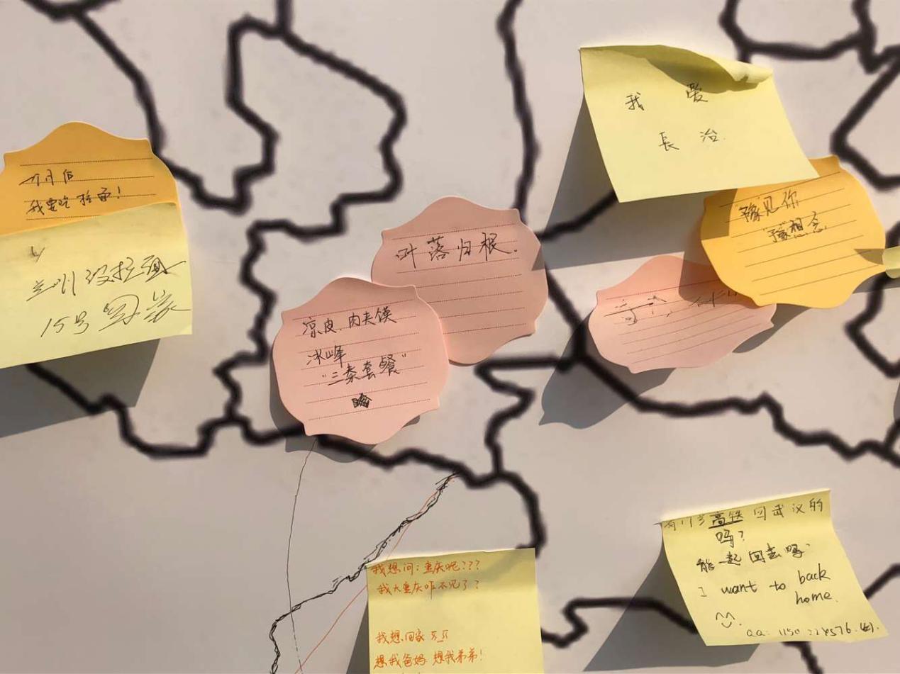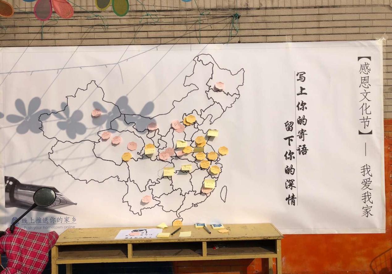 参与活动的同学在便利贴上写下了对家乡的思念与美好祝愿,然后将其贴在了中国地图上自己家乡所对应的区域,既让同学们表达了自己内心的话语,又化解了同学们的乡愁。