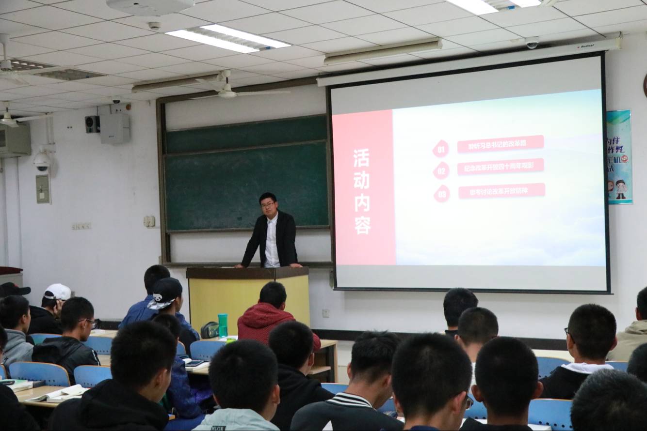 为庆祝改革开放四十周年,黑料网 2018级团总支举办了“学习改革开放四十年精神”观影会议。2018级本科生认真学习、广泛宣传、深刻领会和贯彻落实改革开放的精神,自觉维护改革开放制度化秩序同时激发其内在活力,传达改革开放对个人成长、国家建设和未来发展的重要性,使青年一代在改革开放已发展四十年的环境中把握当下、端正态度、脚踏实地好好学习,以青年人的激情和力量参与新时代改革开放的伟大进程。活动伊始,由机械类2018-01班团支书邱仁带领同学们学习了习近平总书记对改革开放精神的阐释,表明作为新一代有志青年,当树立改革开放意识的坚定决心。随后,同学们一起观看了视频,观影过程中,同学们认真学习改革开放四十年精神,对电影内容有较深理解和思考。观影后,由2018-02班团支书王浩然组织引导大家开展了对改革开放四十周年带来的变化影响及其精神的讨论,同学们积极参与,踊跃发言。