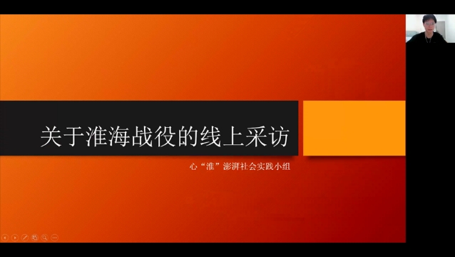谢真同学根据团队所确定的采访大纲,为方便在线上有更好的采访效果,精心准备了采访用的PPT。在询问过被采访人的意愿后,通过腾讯会议的方式进行线上面对面采访。采访问题涉及对淮海战役的了解程度,对红色资源开发的建议等。被采访者深刻的描述了自己对那段惊心动魄的历史的深刻了解以及内心感受,并对于更好地促进人们学习党史、铭记先烈提出了自己的观点与看法与大家讨论。通过本次采访,团队成员们真切地了解到了人民群众,特别是当代大学生对淮海战役等红色历史的热爱及学习情况,并表示这样的学习更加促进自己的爱国情怀。