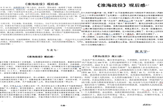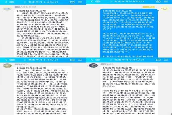 8月10日,实践团开展了线上会议。会议中,团队成员一起观看了电影《大决战之淮海战役》。通过电影中的情节,使我们再一次领悟了革命先烈是怎样抛头颅洒热血,用鲜血与生命建立的新中国,了解了中国革命军是怎样一步步走向胜利的,了解钢铁战士是怎样炼成的。同时告诉我们历史是不能忘记的,也不该忘记的。观看完红色影片,团队成员相互表达了自己对这段红色历史的感悟。8月11日至15日团队成员继续通过线上方式对淮海战役进行深入的了解,同时将自己的感悟发于群中。8月16日至17日,团队成员通过线上会议开展了小作文比赛并且通过朗读的方式评选了名次。8月20日,实践团以线上的方式了解淮海战役纪念馆,通过参观馆藏,我们切身实地的感受着先烈当年的浴血奋战,体会到了今天的国泰民安来之不易,要更加珍惜,牢记历史。