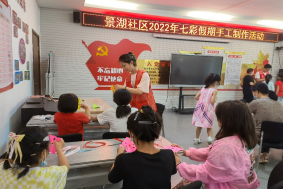 8月16日下午,团队成员提前到活动室布置场地,组织参与活动的中小学生签到就坐。先进行宣讲部分,后与孩子们一起动手,不仅进行了剪纸活动,还参与了制作簪子、发饰等手工活动,能更好加深孩子们对活动的印象,与对活动意义的理解。活动全程由社区负责人拍照协助。