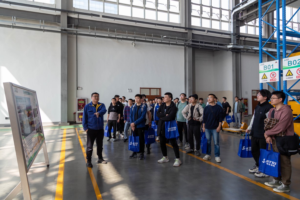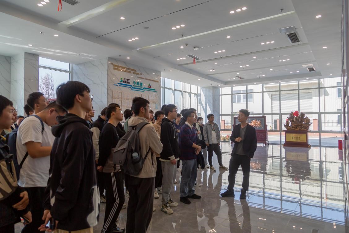 工作人员带领同学们参观了生产车间,向同学们详细讲述了每道工序,并与同学们进行了交流探讨。随后,同学们乘坐大巴前往江苏集萃道路工程技术与装备研究所有限公司,李昂部长进行了热情的接待,并对公司荣誉墙进行了讲解。