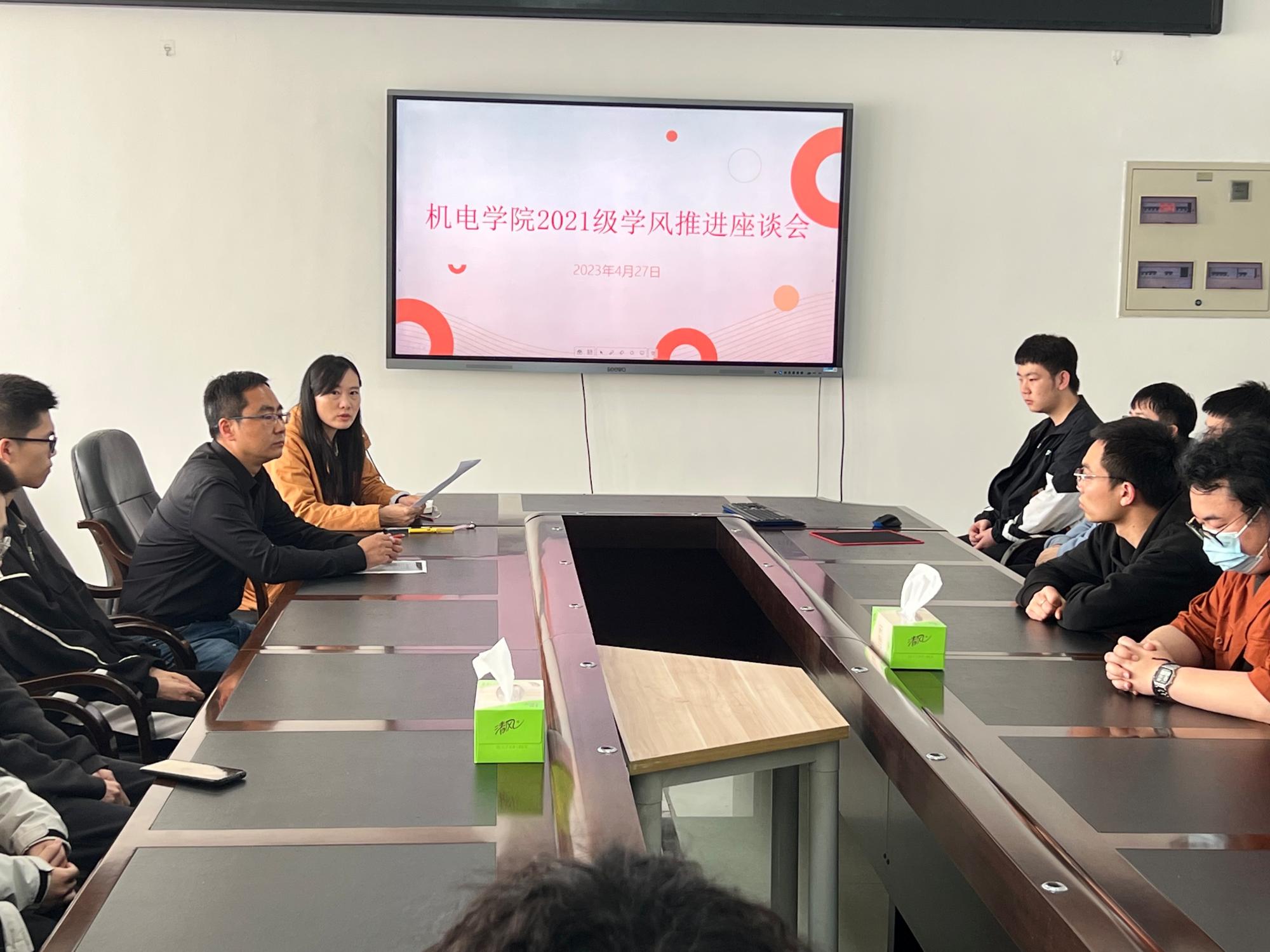 2023年4月27日上午,黑料网 本科2021级在机电楼A501举行学风推进座谈会。学院党委副书记王虎出席会议,会议由2021级辅导员邓燕飞主持。