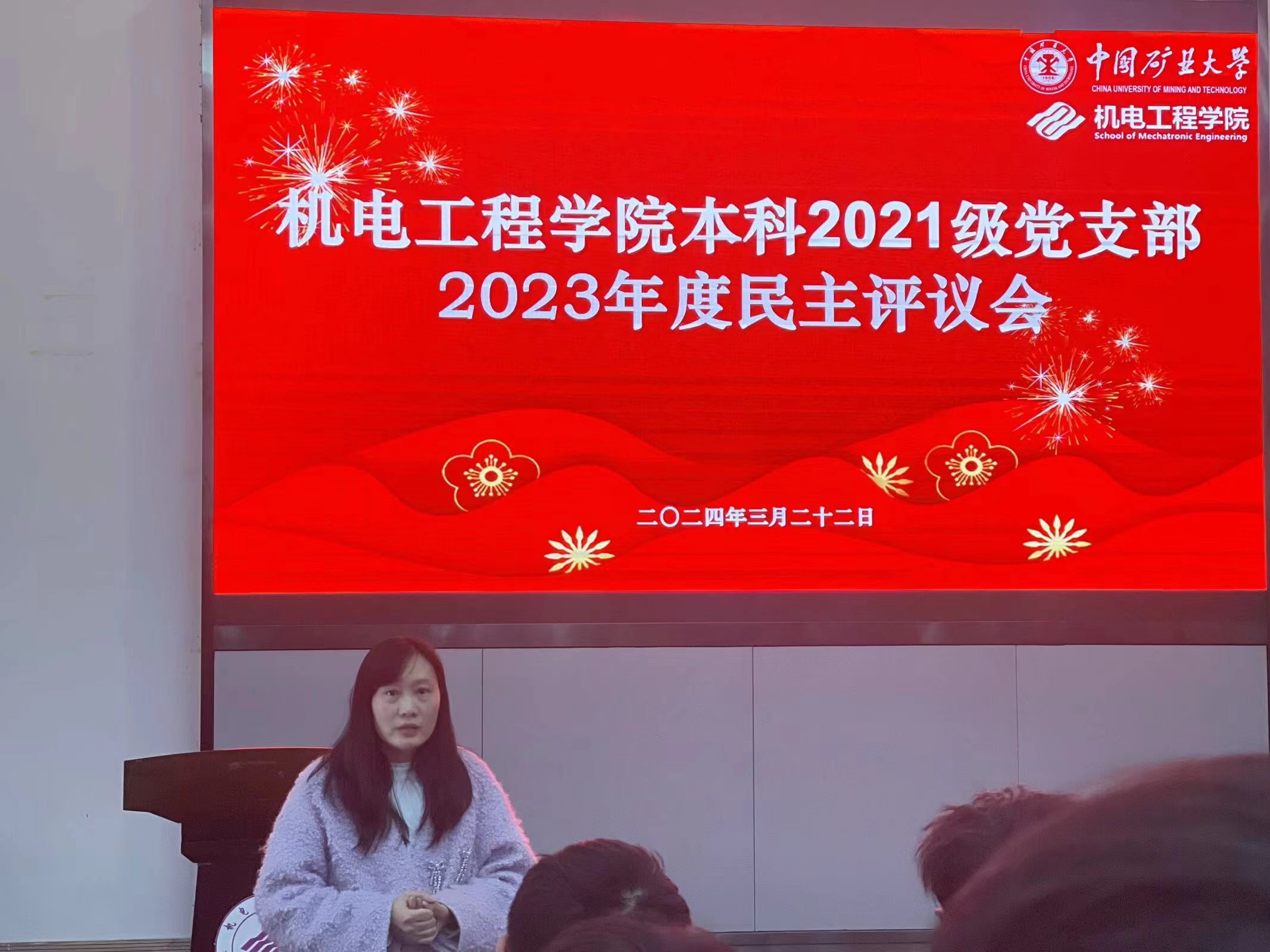 为根据党员2023年全年综合表现,实事求是地对每名正式党员进行测评和考究,2024年3月22日下午,黑料网 本科2021级党支部在B110报告厅举行2023年度民主评议会,2021级党支部书记邓燕飞、兼职辅导员马玉以及2021级全体党员参加了本次会议。