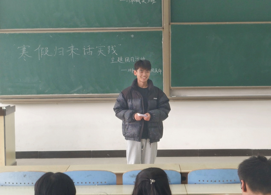 活动开始前,由团支书吉中豪发表了对同学们寒假归来的热烈欢迎,并进一步肯定了同学们在假期生活中做出的许许多多的实践活动,相信同学们在大学的第一个寒假一定过得非常充实且愉快。接着,由代表同学邹权、吉中豪依次上台分享了自己寒假的实践经历。邹权同学寒假期间回到了母校看望了曾经教诲过自己的老师,在高中的课堂上与学弟学妹们分享了自己曾经的奋斗故事,与他们畅聊大学生活的美好与快乐,为高三学弟学妹们剩下的一百天注入了源源动力吉中豪同学分享了他在家乡政务服务中心担任督察员的工作,他说,虽然他的这份工作看似无足轻重,甚至清闲,但在实践工作期间,他发现,对于一项完全陌生的工作,一定要用心去学习,否则,即便是最简单的任务,依然可能在不细心中犯下致命的错误