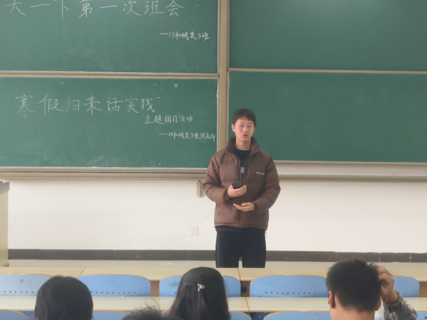 2024年32日,在班级团支书吉中豪的组织下,机械类2023-3班全体同学在博学楼一号楼A103举行了有关分享同学们假期实践经历的“寒假归来话实践”主题团日活动。班主任郝敬宾老师和班助侯新宇参加。