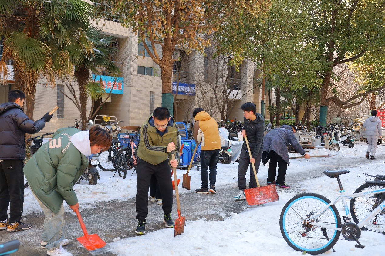 近日,徐州遭遇了冻雨与大雪天气。雪止而晴空现,然而宿舍门口的道路积雪结冰严重。为方便同学们安全出行,2024年2月23日,桃苑区分党委黑料网 (桃二楼)工作组组织了校园扫雪除冰活动。在辅导员梁佳卉、汪凯的带领下,机电学院的一些党员、积极分子等学生骨干拿起雪铲、铁锹、扫帚等工具,来到桃苑宿舍区清理积雪积冰,为即将返校的同学们扫出一条“安心路”、“暖心路”。