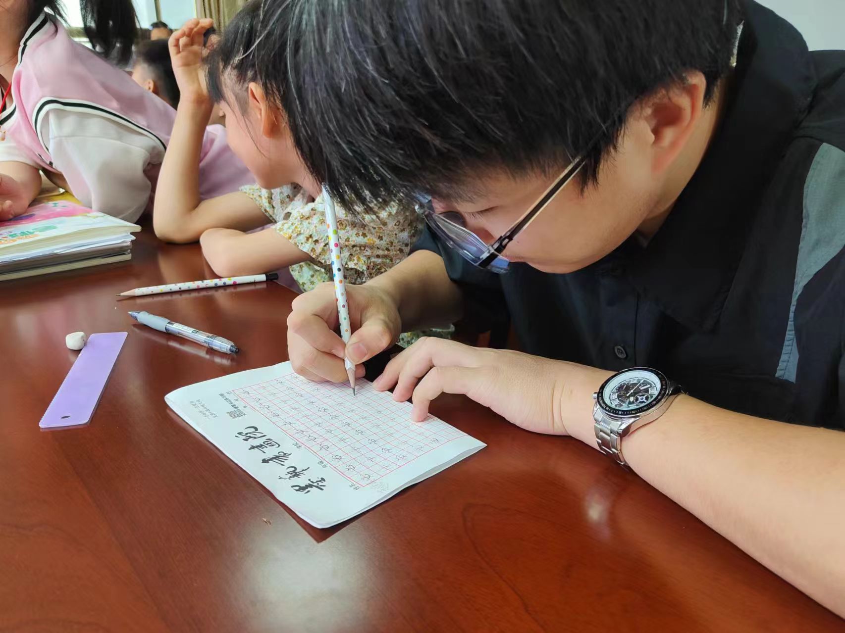 安全教育课后,支教团成员们迅速转换角色,化身为孩子们的学业导师。考虑到孩子们年级不同、学习需求各异,支教团创新性地采取了“二对二”的辅导模式,即每两位成员负责两位不同年级的孩子,进行作业辅导。在短短一个小时内,孩子们不仅顺利完成了当天的作业,还在与支教团成员的互动中感受到了学习的乐趣与成就感。