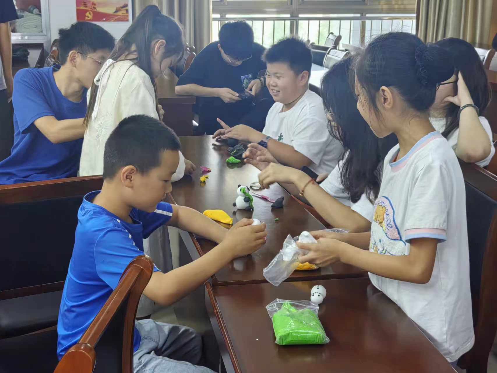支教团成员和小朋友们正在制作粘土模型