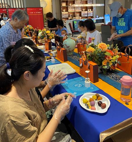 活动现场,面点老师讲授了月饼的制作步骤、基本要点和压模技巧等内容,并现场给大家展示了月饼制作示范。一开始大家手法还比较生硬,但在面点师的指导下,揉面、打平、包馅、搓圆、入模、压实、出模,这一整套月饼制作步骤大家都能一气呵成,如行云流水一般。不一会儿,一个个精致的月饼胚体就完成了,最后,大家把制作好的月饼放进烤箱烘烤。现场一片片欢声笑语,空气中都弥漫着欢乐的气息。