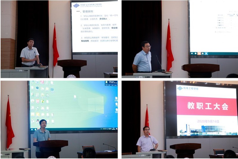 周公博副院长通报了研究生录取、招生、复试及报到的情况和近期科研成果进展;刘送永副院长介绍了本年度学校本科教学主要工作和学院教学工作要点;胡卫新副院长重点解读了学校公房改革方案的相关内容;学院党委副书记王虎通报了毕业生就业和学生报到情况。