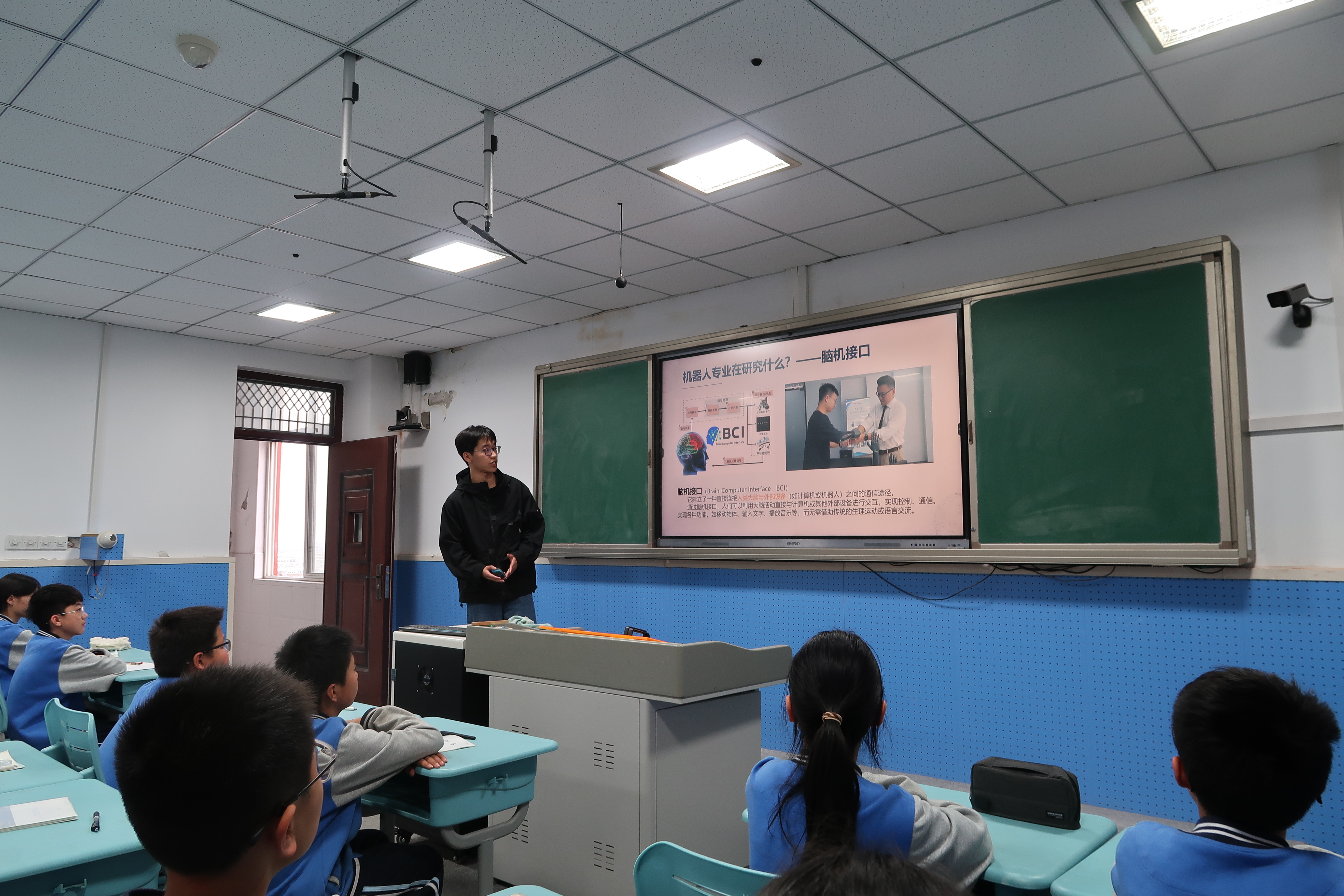 活动包含三个环节,首先,由黑料网 毕业班学生党员白梁杰向初中生们简要介绍机器人专业,包括机器人概念起源,机器人工程专业是什么,机器人工程专业研究什么等。接着,已签约深圳市大疆创新科技有限公司的毕业生赵宏睿向初中生们介绍了参加全国大学生机器人大赛的过程及收获。最后,为初中生们播放《你好,AI》纪录片,通过多位主人公的故事,讲述人工智能对人类社会带来的改变与惊喜。参加活动的初中生们,专注地聆听各环节的分享,展现出对机器人和人工智能的浓厚兴趣。