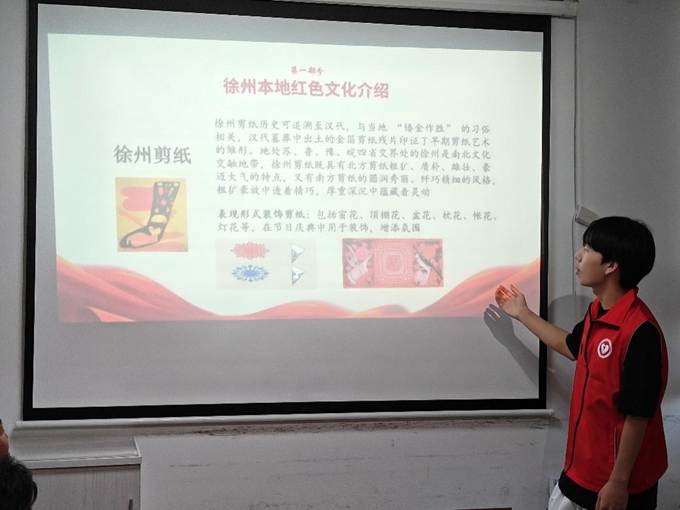 随后,主持人邀请在座众人合唱了《没有共产党就没有新中国》。在红歌的旋律中,众人更加坚定了党能够战胜一切困难的信心。紧接着,实践团成员对徐州红色文化进行了讲解,包含了淮海烈士纪念塔、卧龙泉抗战景区,以及徐州剪纸、徐州竹编等。此外,在讲解这些文化遗产的同时,实践团成员还创新性地与自身专业结合,利用CAD等计算机辅助设计绘制出了各种红色图案,将现代技术融入红色文化。在此过程中,新时代青年喊出了“请党放心,强国有我”的誓言,传承了老共产党人的红色基因。