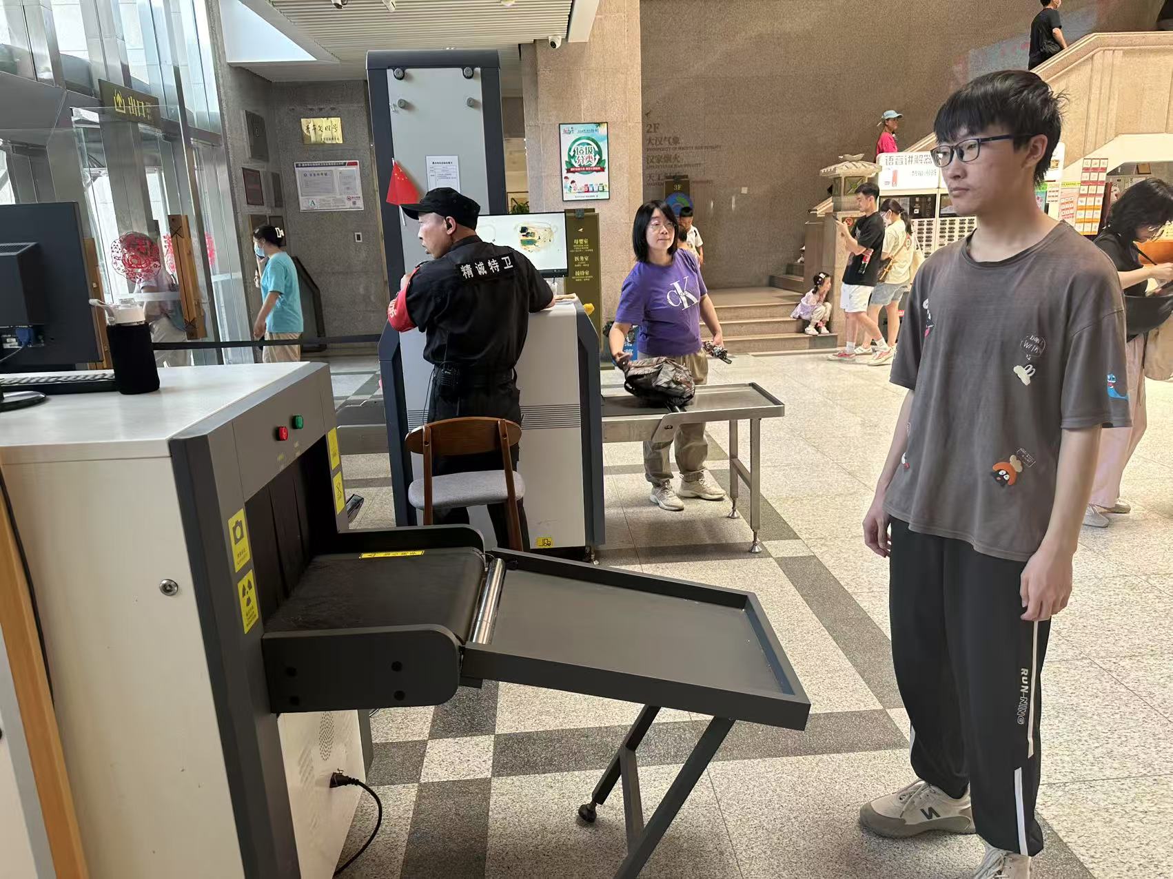 此外,志愿者杨悦涵和田丰恺负责博物馆大门的安检及引导工作。他们耐心地为游客解答疑问,维持入场秩序,确保参观流程顺畅有序。他们的细致服务为博物馆的安全运营提供了有力保障。