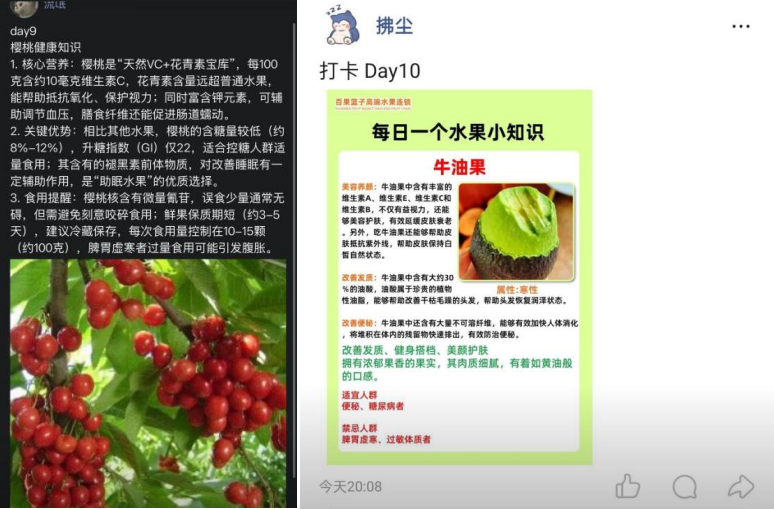 活动期间,同学们踊跃打卡,不仅展示了种类繁多的时令水果,也通过图文学习了丰富的营养学知识,在互动中提升了健康生活的意识。活动组织方每日对打卡内容进行监督与记录。轻松有趣的的打卡形式,有效提升了学生的参与感与获得感,不少同学在活动结束后表示通过持续打卡不仅养成了摄入水果的好习惯,也更深入地理解了均衡饮食的重要性。