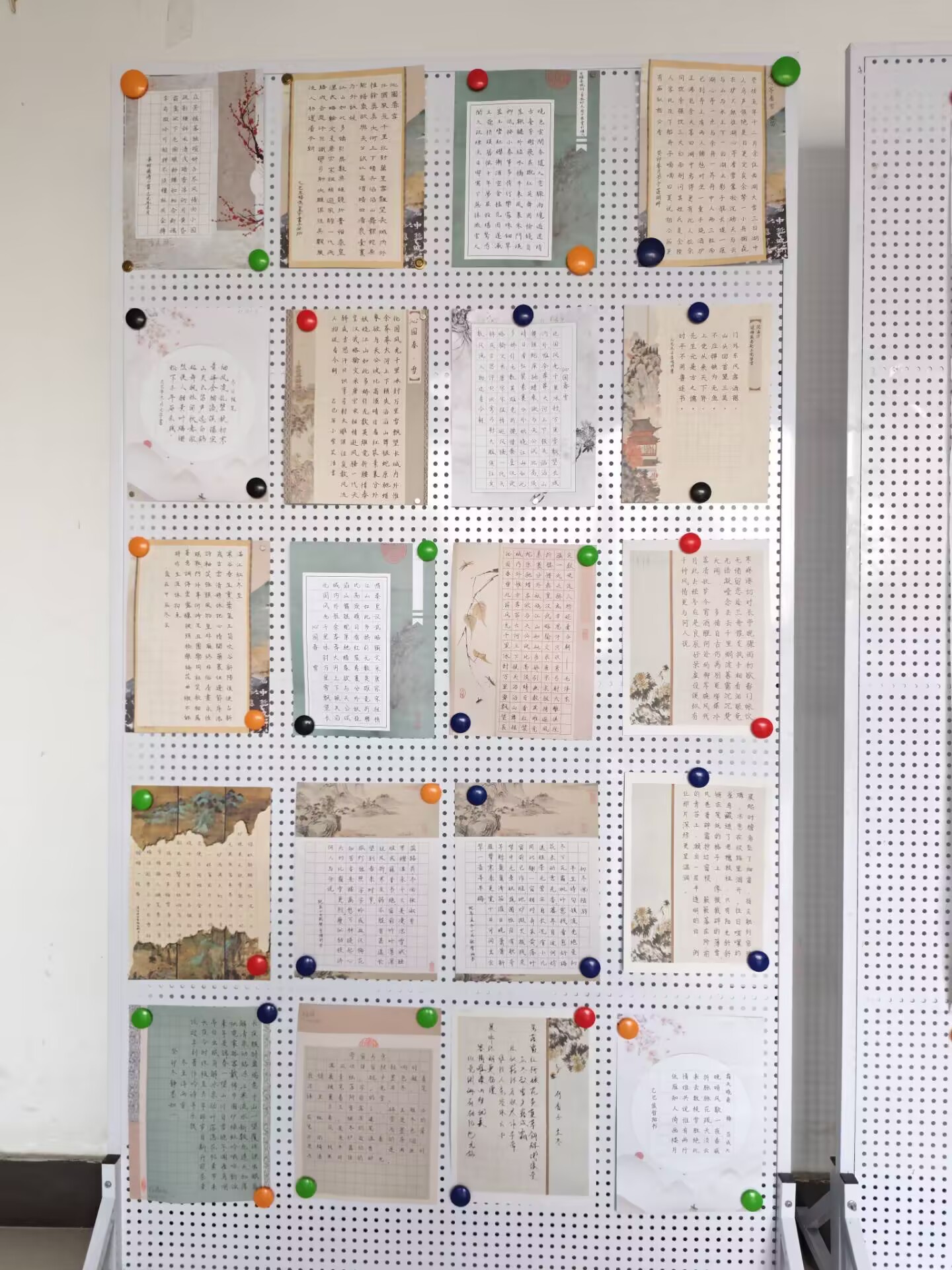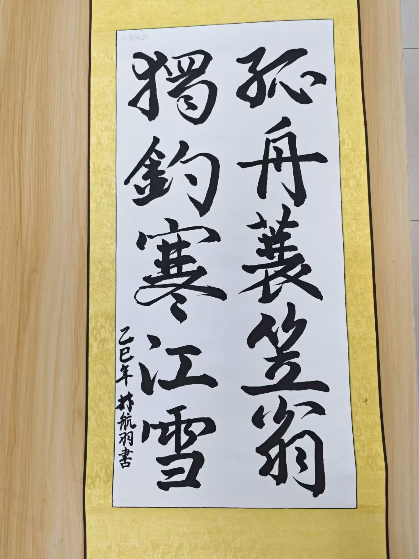 在书法展区,作品或遒劲凝重,或清秀飘逸,涵盖了楷、行等多种书体。其中,一幅书写唐代诗人柳宗元名句“孤舟蓑笠翁,独钓寒江雪”的书法作品尤为引人注目,笔力苍劲,气韵生动,充分展现了作者对传统笔法的领悟与冬寂之境的诠释。多幅作品通过或素雅或典雅的装帧,被巧妙布置于展板之上,形成了一道富有层次感的视觉风景。