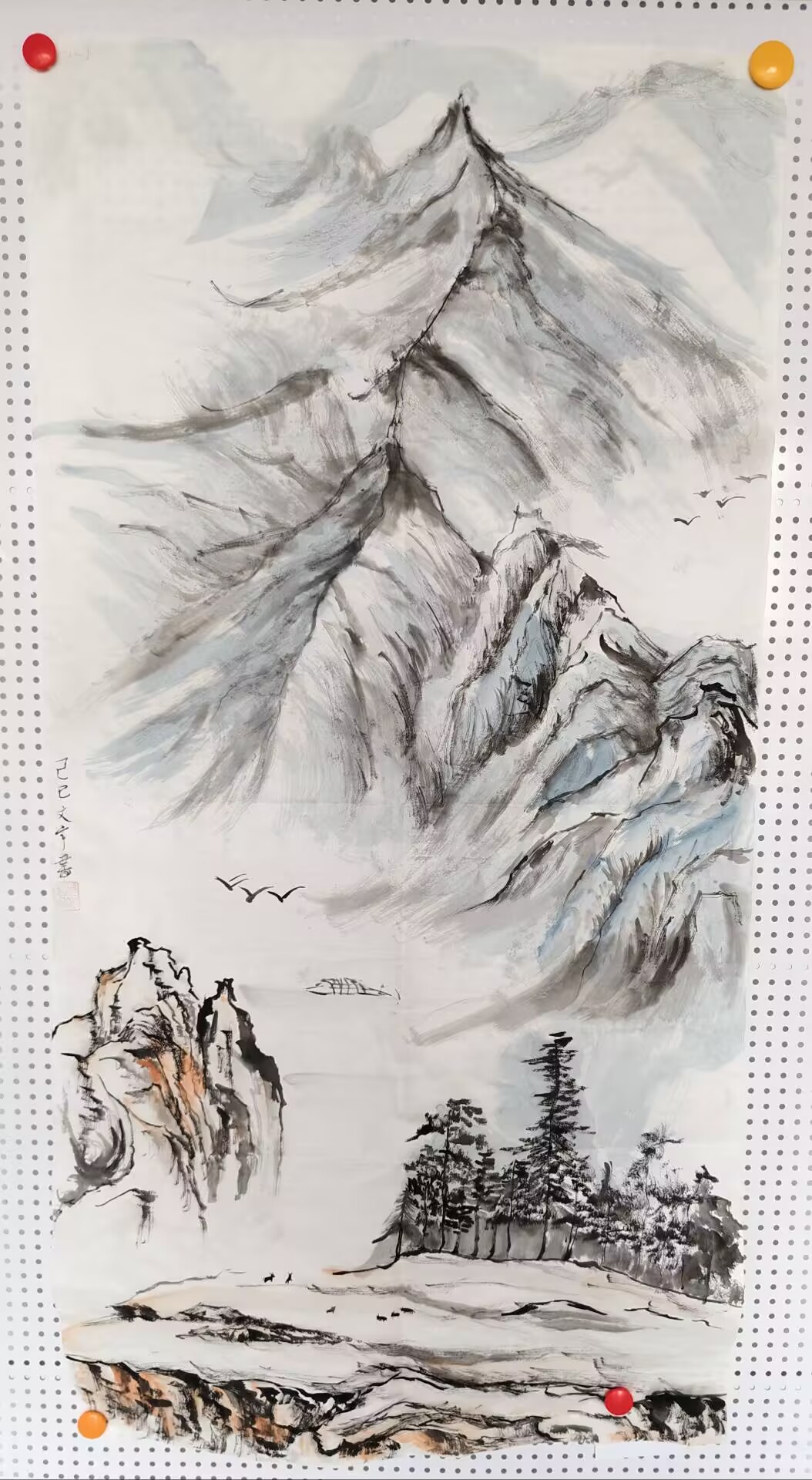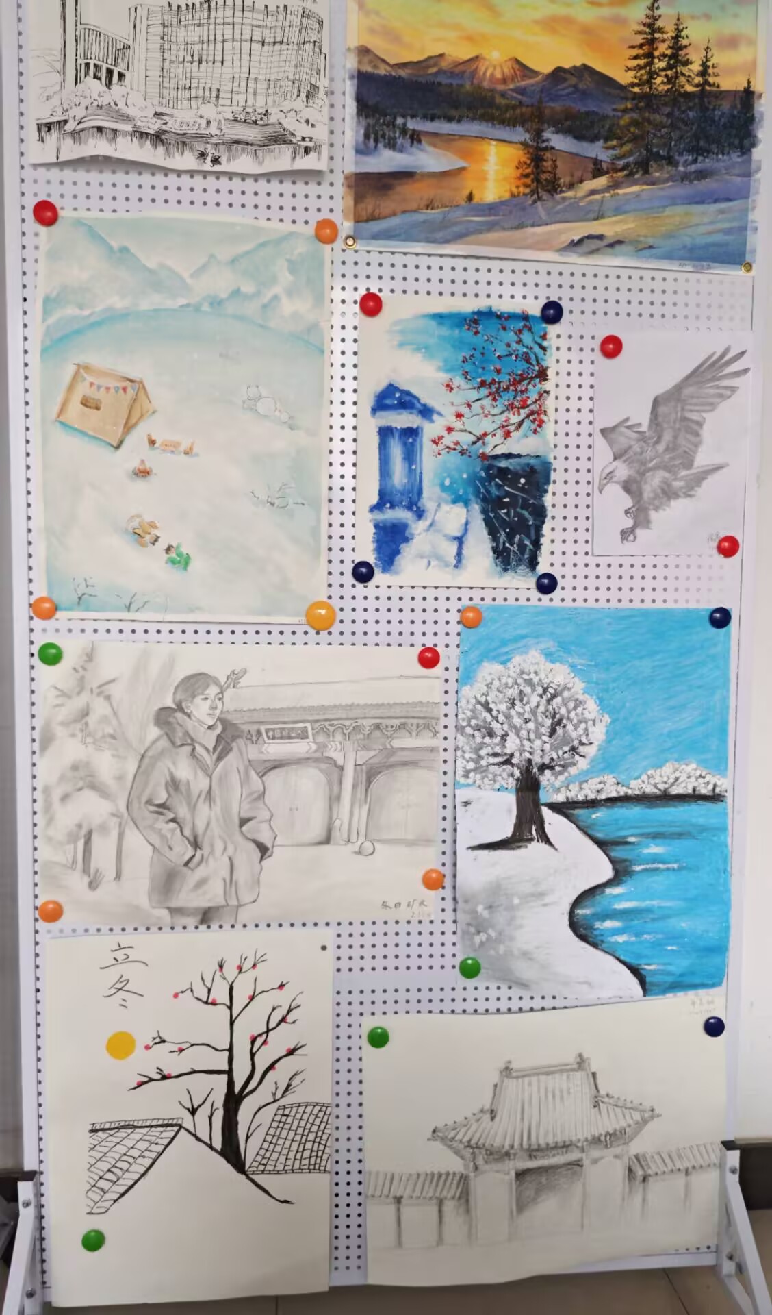 绘画展区同样精彩纷呈,同学们以多元的视觉语言描绘心中的冬日清寒。一幅细腻的黑白速写,以精准的线条勾勒出冰凌垂挂、覆雪掩映的传统建筑檐角,意境萧瑟而静谧。另有作品以水彩渲染雪山湖影,或以素描捕捉枯枝劲树、雪中人物的瞬间,其中一幅题为“立冬”的画作,以简练笔触绘出冬日园林一角,颇富意趣。这些作品从不同角度捕捉了冬季的物象与情感,展现了同学们敏锐的观察力和艺术表现力。此外,传统水墨山水画作也备受好评。画中远山巍峨,云烟缭绕,近处松石挺立,飞鸟点缀其间,墨色浓淡相宜,营造出悠远深邃的意境,体现了作者对国画精髓的深入理解和对自然万象的关照。