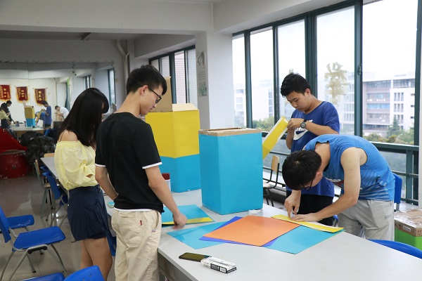接下来,为了顺利开展环保实践团设计工作,机电学院暑期环保实践团设计组全体于7月21日在桃二c418设计纸质的可分类垃圾箱。设计组组员们用胶带将废旧纸箱拼接在一起,成为能装载垃圾的可利用箱子;用彩色卡纸将环保箱包装起来,其中,不同的颜色代表不同的垃圾分类类别;然后,设计组组员们将标识贴在了箱子上;最后,设计组组员们将设计好的装饰物贴在了箱子上,改造废旧物品成为可以装垃圾的分类垃圾桶完成。