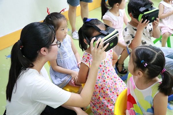 下午三点半左右,环保实践团VR团队来到了社区内的幼儿园,将要和孩子们一起领略3DVR视频的乐趣。首先,孩子们各自在座位上做好,分为四排;接下来由团队成员调试好仪器为孩子们佩戴上,孩子们通过转换角度能看到视频里不同的画面,孩子们充满着对这个仪器的好奇心,现场气氛活跃,后面排队的小孩子们跃跃欲试;最后由指导老师们引导学生探索VR视频的原理。此次视频团队通过让孩子们体验VR视频,增长了孩子们科学探索的眼界,也是一次很好的交流建设。