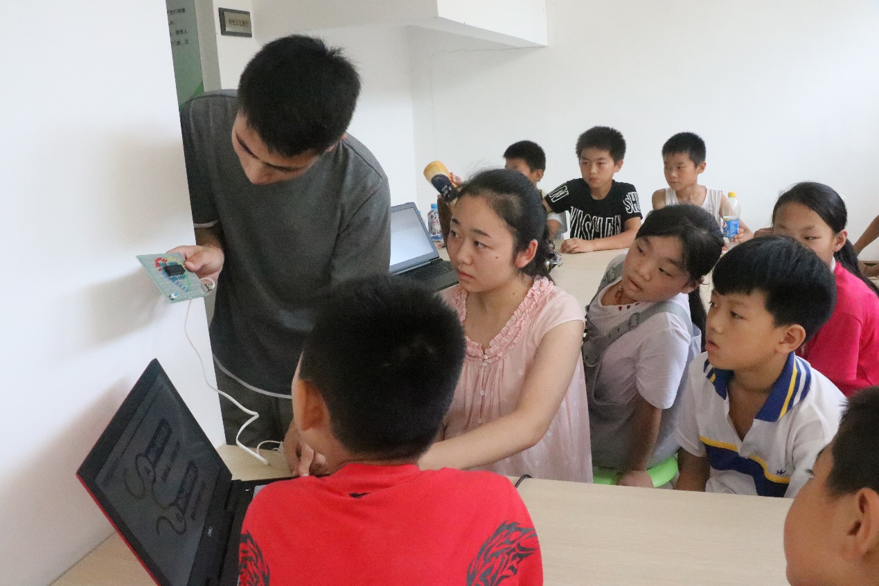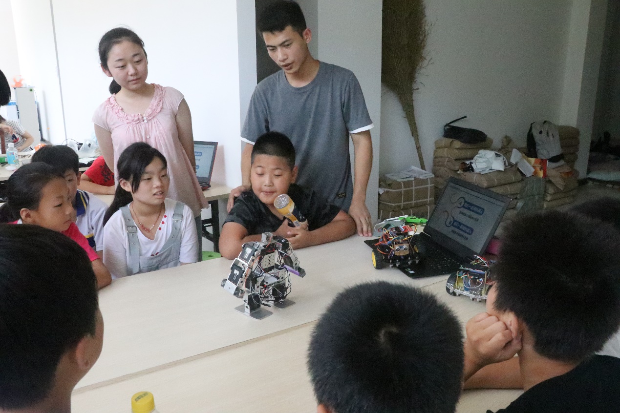 7月26日上午,“心手相连”支教团志愿者为孩子们讲授机器人方面的课程。上午9:00,课程准时开始。两位志愿者先简要介绍了机器人的基本理论,如机器人的分类和控制原理。理论知识非但不令孩子们感觉枯燥,反倒激发起了他们的好奇心。